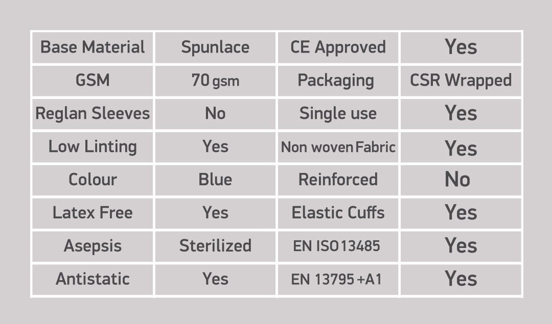 This High Risk Gown consists of Full front and Arms which are made out of Spunlace SSMMS which have an absorbent material on the outside with PE film in middle and abosbent layer on the inside.